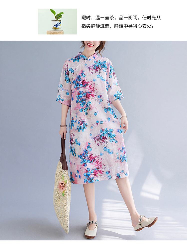 コットンとリネンのドレス夏のルーズファットmm中国のレトロな印刷斜めに大きいサイズの女性のスタンドアップカラーミドル丈の改良されたチャイナドレス 大きめサイズ サマー 夏物 TB2-50 TB2-5063723791705