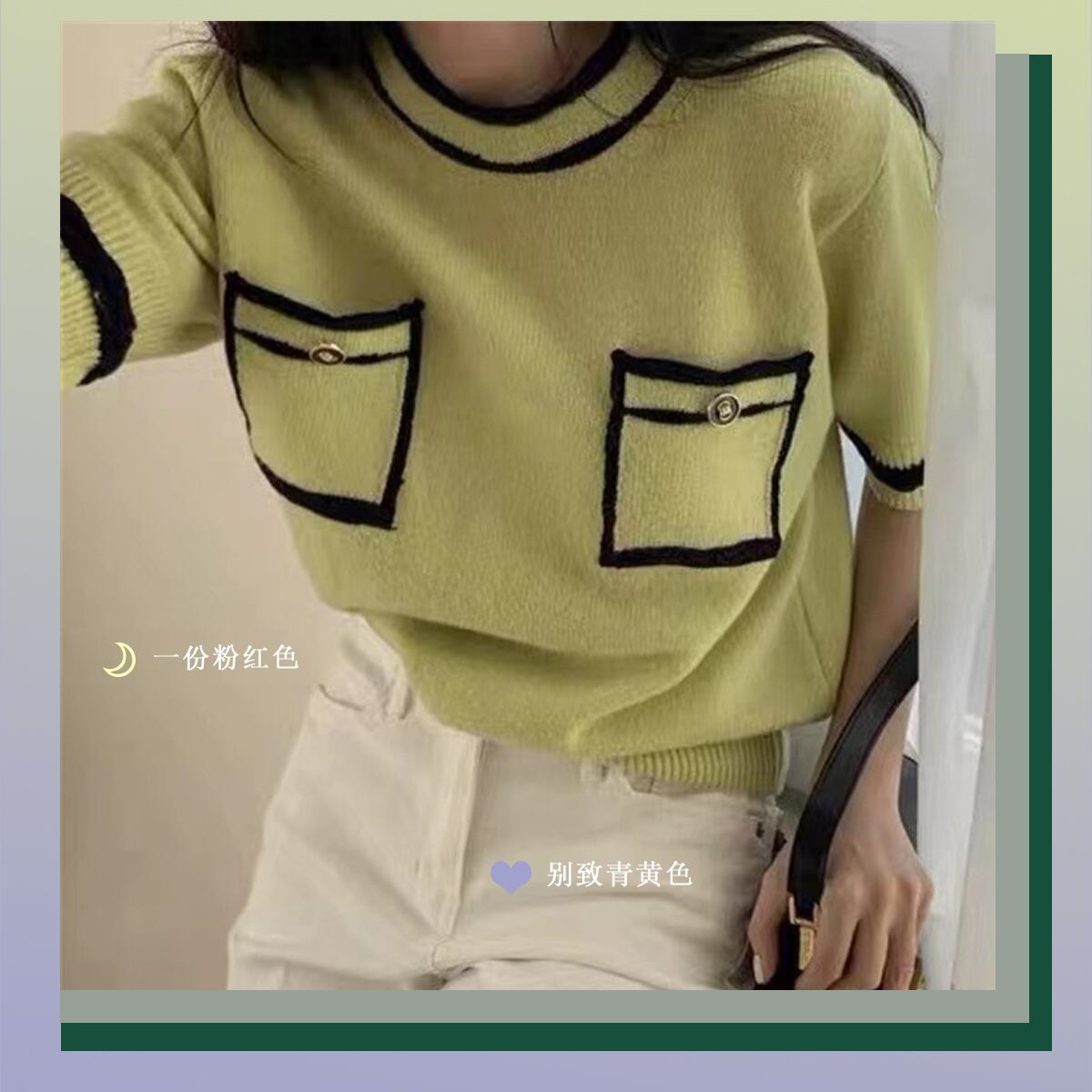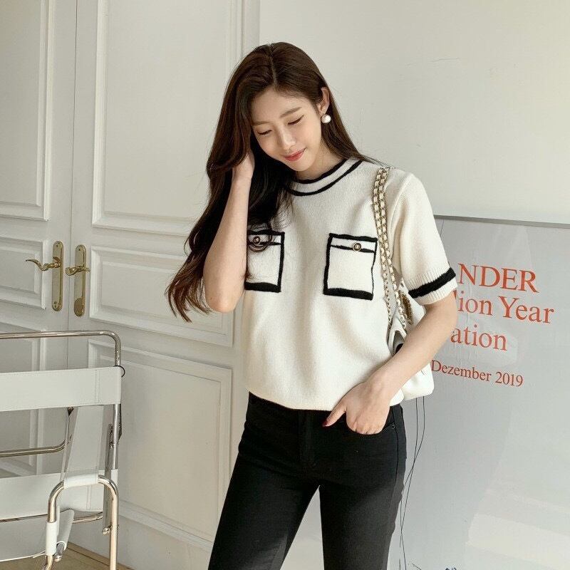 サウスのドンデムンカラーマッチングポケット薄手のニットセータースモールフレグランス半袖Tシャツ女性夏ルースアイスシルクトップ サマー 夏物 TB2-52 TB2-5237656509838
