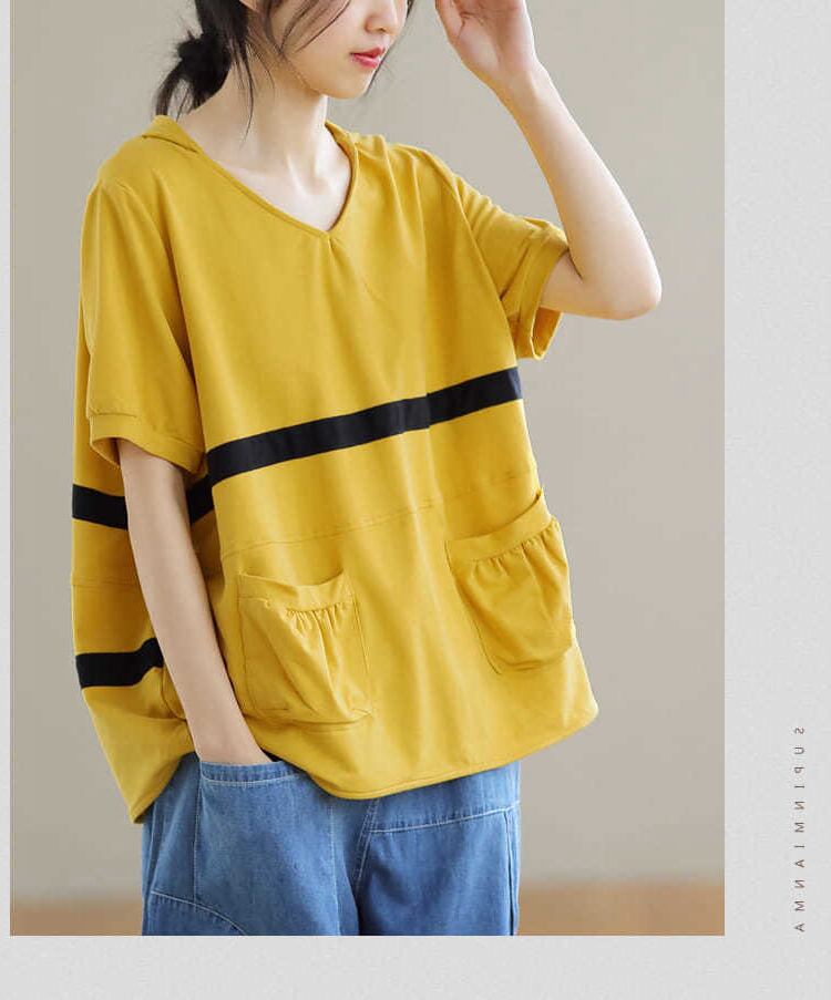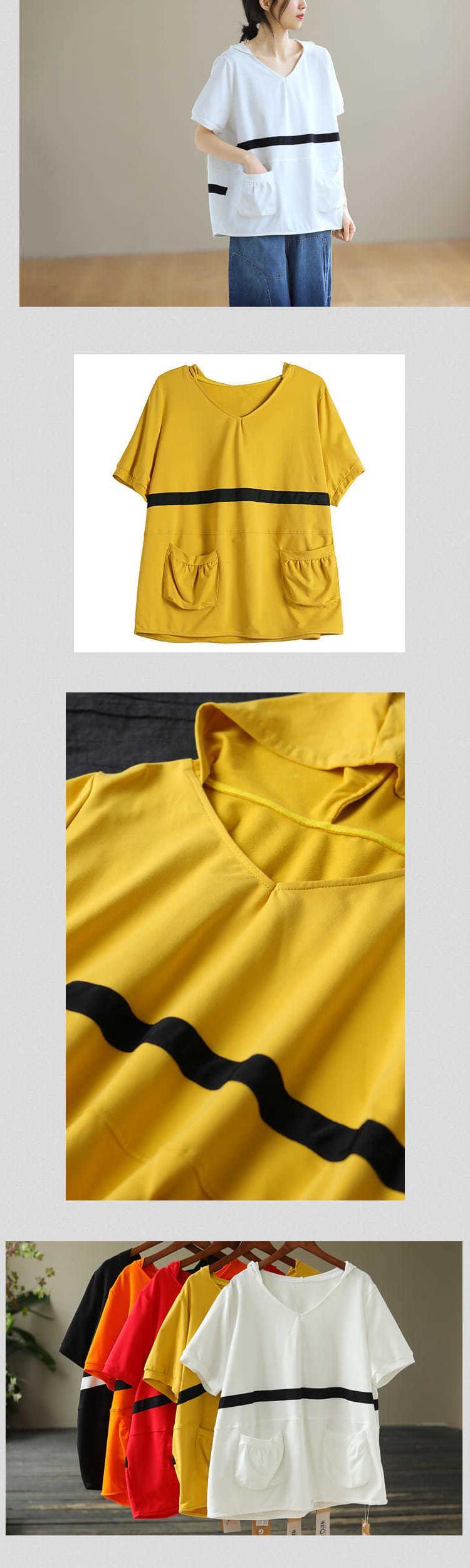フード付きセータールーズラージサイズ半袖薄手の夏の新しいVネックステッチブラックストリップオールマッチカジュアルTシャツ 大きめサイズ サマー 夏物 TB2-53 TB2-5377531602728