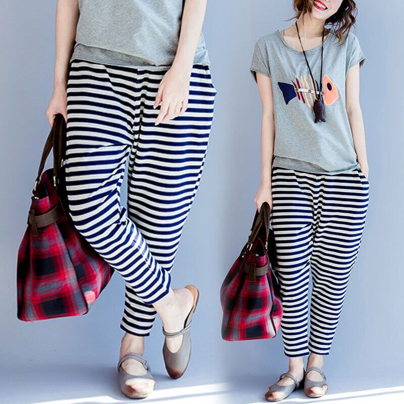 ファットmmサマー香港スタイルのストライプカジュアルパンツオールマッチコットンルーズクロップドパンツやや太くて薄いプラスサイズのハーレムパンツ女性 大きめサイズ 夏物 TB2-36 TB2-3692287487499