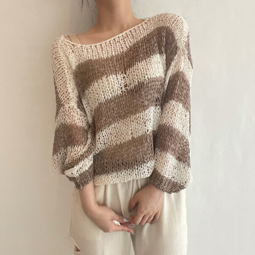 ストライプカラーマッチング中空薄ニットセーター女性夏長袖日焼け止めシャツワンショルダートップルーズ怠惰なセーター ロング サマー 夏物 TB2-52 TB2-5253456145313