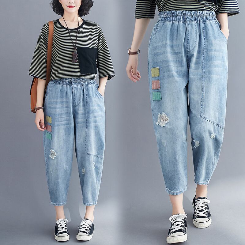 アートプラスサイズレディースデニムハーレムパンツサマールーズファットmmハイウエストパッチホールカジュアル9点キャロットパンツ ハイウェスト 大きめサイズ 夏物 TB2-50 TB2-5074754348554