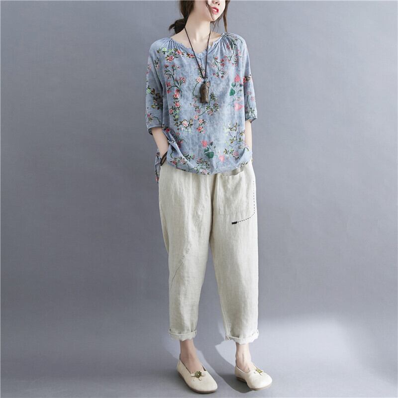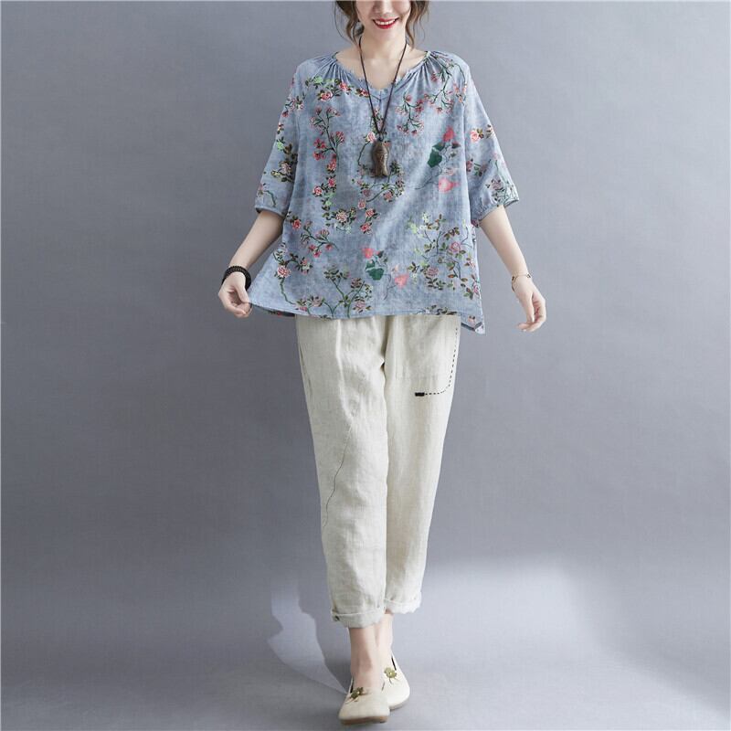 プリントの薄いコットンとリネンのブラウス夏のルーズファットmmカバー腹の痩身プラスサイズの女性のラミー半袖Tシャツの女性 大きめサイズ サマー 夏物 TB2-50 TB2-5036949808306