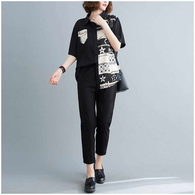 2021年夏の新作トレードラージサイズコントラストカラー非対称プリントシャツ半袖ラペルボタン付きベリートップ 大きめサイズ サマー 夏物 TB2-59 TB2-5972395495434