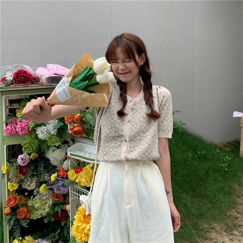 小さなデイジーフローラルブラウス女性夏パフスリーブショートニットカーディガン薄いルーズラウンドネックスモールジャケット サマー 夏物 花柄 Oネック TB2-52 TB2-5284353411648