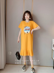 フィッシュテールスカートワンピースレディース半袖ルーズラージサイズは薄フリルストレートサマーコットンロングTシャツスカートトレンド 大きめサイズ 夏物 TB2-16 TB2-1663967815038