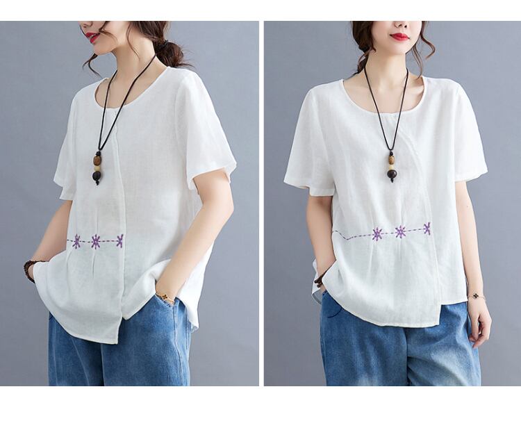 2021年の文芸的で芸術的な大きなサイズの刺繡半袖リネンTシャツルーズカジュアルオールマッチ薄くて太いMM気質コットンとリネントップ 刺繍 大きめサイズ TB2-12 TB2-1280090926361