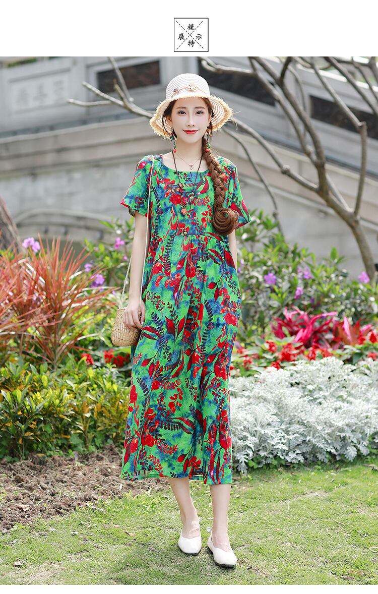 夏の新しいレトロなエスニックスタイルの大きなサイズの女性の綿とリネンのドレスの女性ルーズで薄い文学的な花柄のロングスカートの女性 コットン 大きめサイズ サマー 夏物 TB2-12 TB2-1280759652286