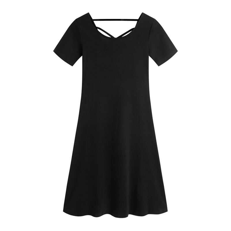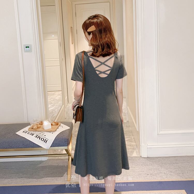2021年春の長い膝上純綿半袖Tシャツ女性プラスサイズ中空オープンバックグレーAラインドレス ロング コットン 大きめサイズ スプリング 春物 ピュア TB2-16 TB2-1661981283796