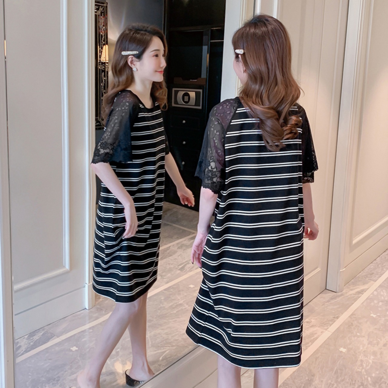 ストライプ半袖ミドル丈Tシャツレディースストレート新夏バージョンブラックTシャツ純綿トップボトミングシャツタイド コットン サマー 夏物 ピュア TB2-16 TB2-1682734626309