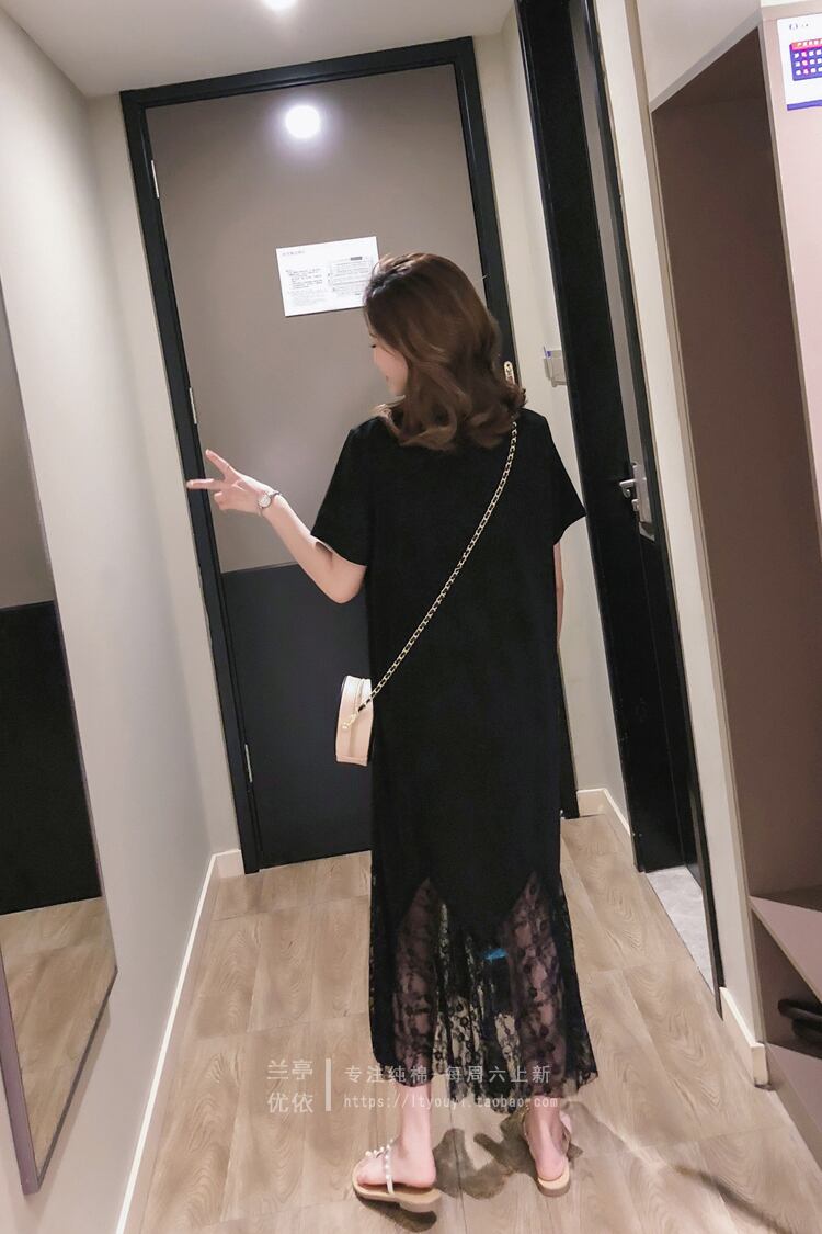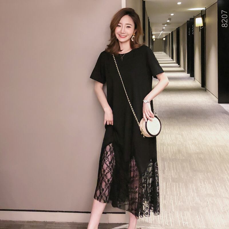 夏の新しいプラスサイズの女性のミドル丈Tシャツ、黒の痩身、年齢を減らすメッシュステッチドレス ブラック 大きめサイズ サマー 夏物 TB2-16 TB2-1652399351409