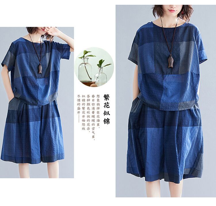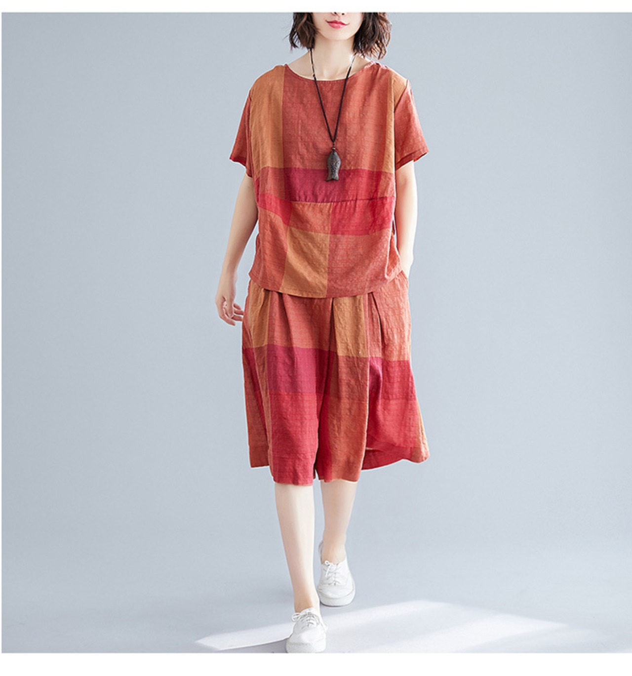 コットンとリネンのチェック柄スーツ女性2021年夏プラスサイズカジュアル半袖5点袴リネンカジュアルツーピーススーツ 大きめサイズ サマー 夏物 TB2-12 TB2-1230976805087
