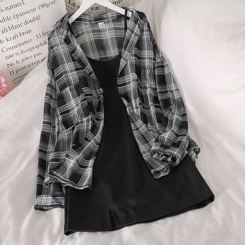 年齢を減らすカジュアルファッションスーツツーピースデザインルーズで薄い日焼け止めチェック柄シャツレディースサスペンダードレス TB2-6 TB2-616248094202