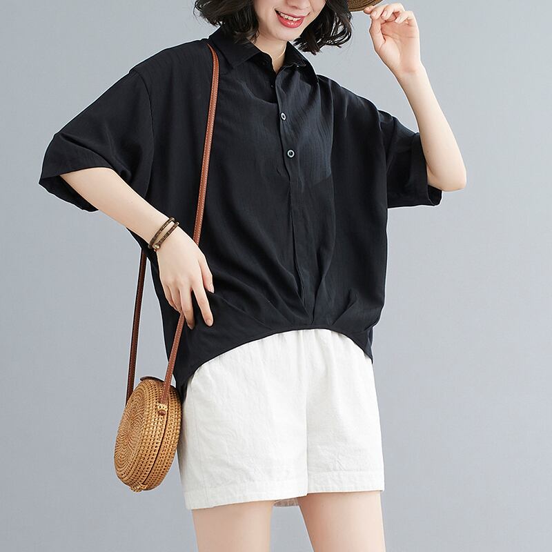 2021年夏の文芸的で芸術的な無地の大きいサイズのシャツの女性はルーズで薄いオールマッチの半袖カジュアルリネンラペルトップ 大きめサイズ サマー 夏物 ソリッドカラー TB2-12 TB2-122297857604