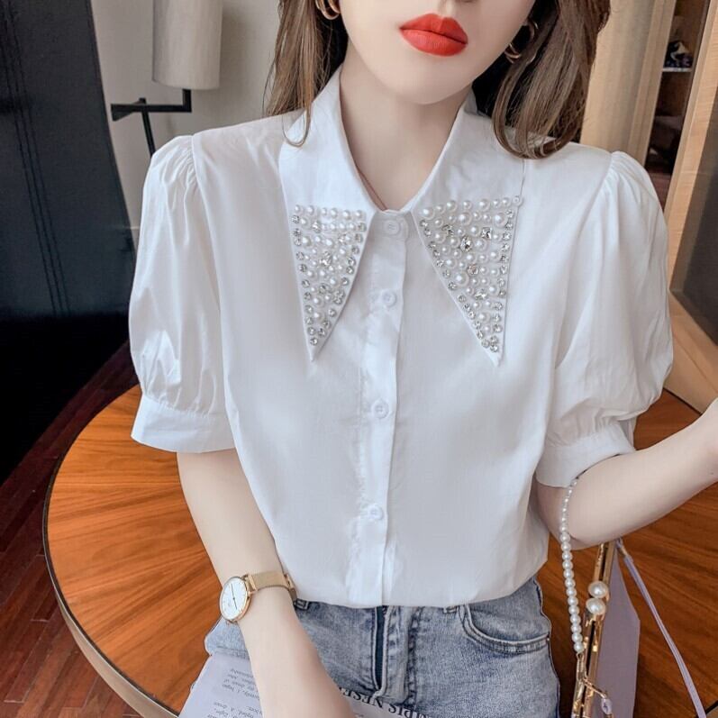 ビーズのポロカラーの白いシャツの女性2021年夏の新しいスタイルのファッション気質デザインセンスニッチトップ半袖シャツ ホワイト サマー 夏物 TB2-6 TB2-616494158613