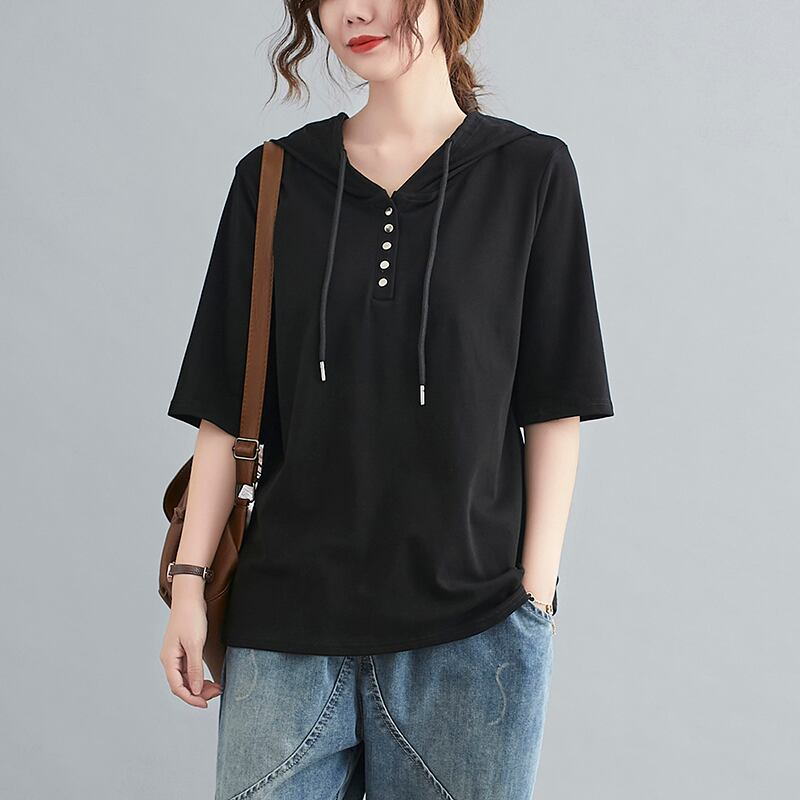 サマーバージョンの無地フード付きTシャツ女性文学とアートファンコットン半袖プラスサイズ女性用ファットmmルーススリミングトップ 大きめサイズ 夏物 ソリッドカラー TB2-12 TB2-1246744335788