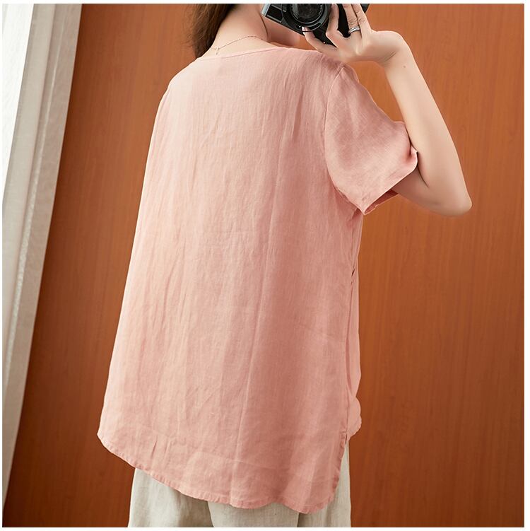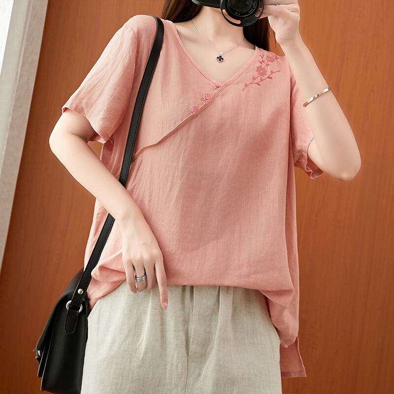 2021年夏の新しいスタイルの文学的なレトロな綿とリネンの刺繡Vネック半袖Tシャツルーズラージサイズの女性用リネントップ コットン 刺繍 大きめサイズ サマー 夏物 Vネック TB2-12 TB2-127416481195