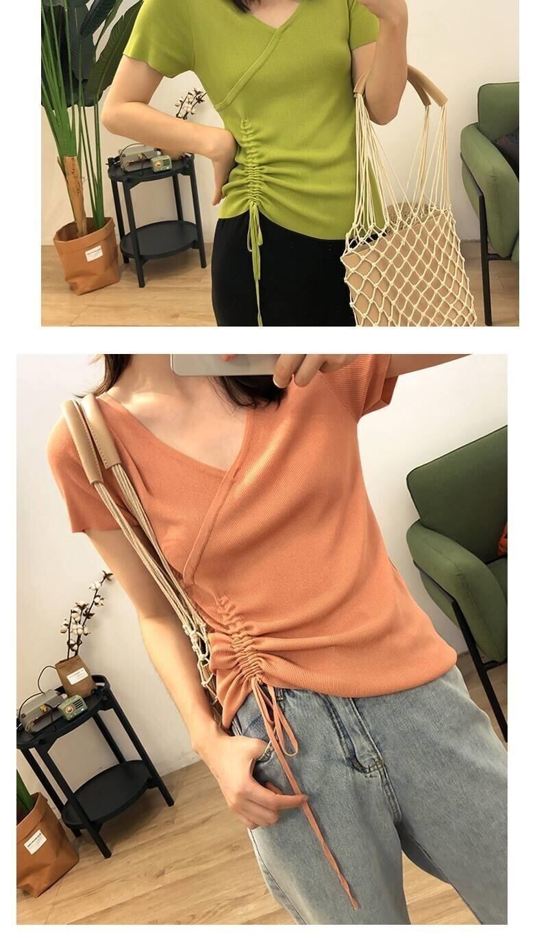 タイトフィットVネックアイスシルクニット半袖Tシャツレディース薄裾、丁寧なマシンサイドドローストリングイレギュラートップサマー 夏物 TB2-6 TB2-625774424539