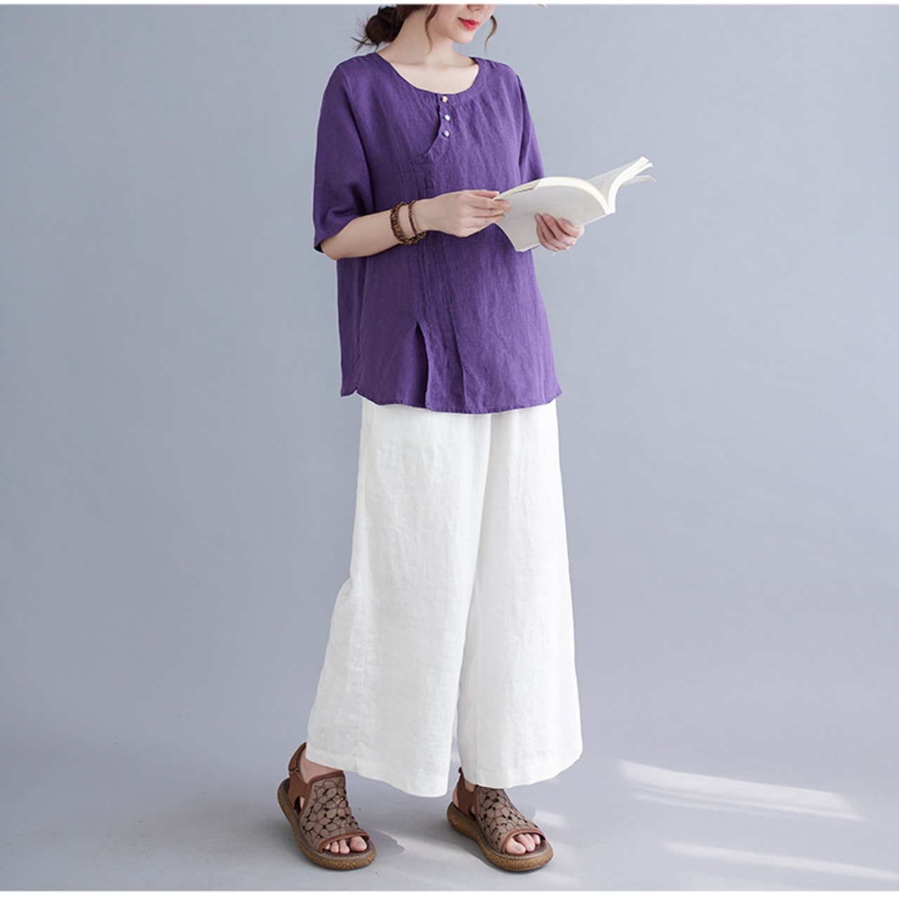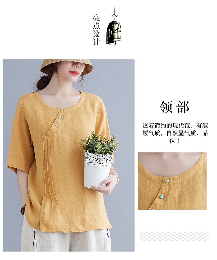 エスニックスタイルの斜めカラーボタンリネンシャツ2021夏ルーズアート半袖カジュアル通気性コットンとリネンTシャツの女性 サマー 夏物 TB2-12 TB2-1244201999673