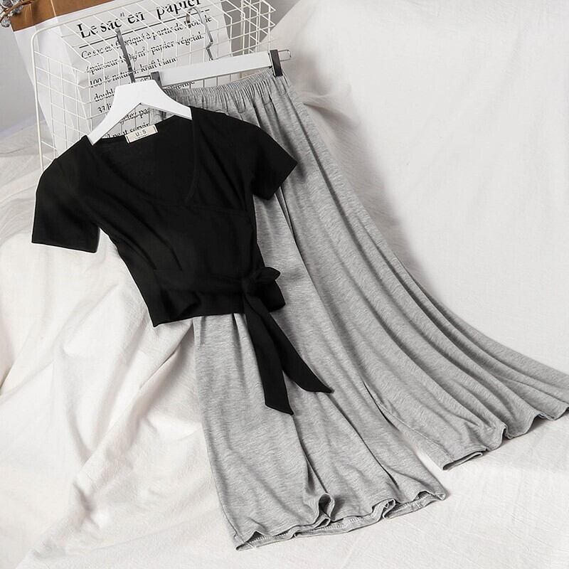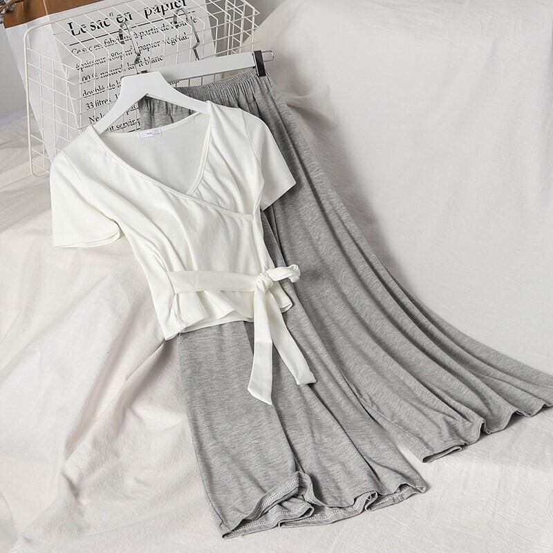 女性の夏のスーツ、背の高い小さな、短いトップ、Vネック、クロスタイTシャツ、ハイウエスト、薄い、ワイドレッグパンツ、ツーピーススーツ ショート サマー 夏物 TB2-6 TB2-638726254813