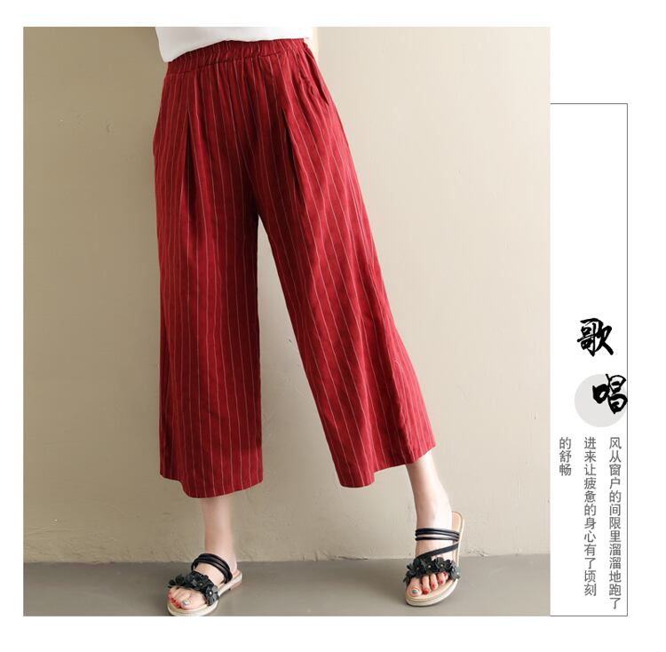 ストライププリントコットン&リネンカジュアルパンツ伸縮性ウエストルーズクロップドパンツ斜めポケットリネンストレートワイドレッグパンツレディースパンツ エラスティック TB2-12 TB2-127163992879
