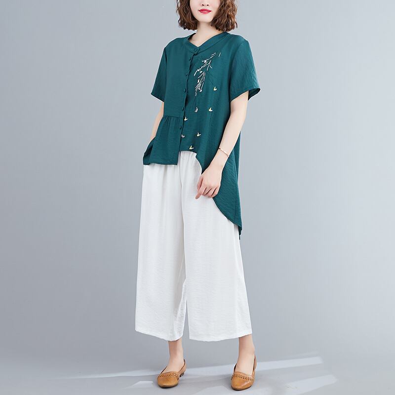 ツーピースカラーマッチングイレギュラーコットンとリネンツーピースフリル刺繍ボタン付きスタンドカラーシャツワイドレッグパンツルーズファッションスーツ レッド TB2-12 TB2-1228645283223