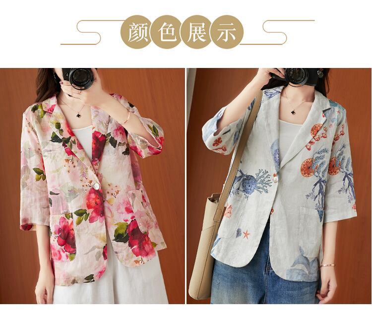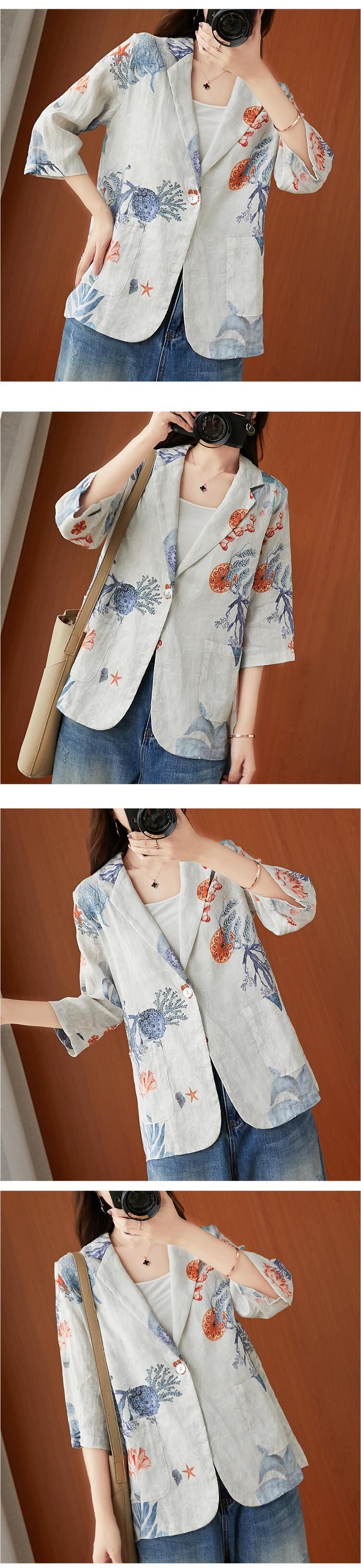 夏の新しいスタイルの文学的なレトロなプリントの綿とリネンの小さなスーツの女性の七分袖のルーズカジュアルなワイルドスーツの薄いジャケット コットン サマー 夏物 TB2-12 TB2-1267599585605