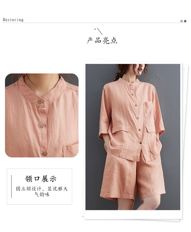 2021年無地のコットンとリネンの痩身年齢削減スーツラウンドネック5点袖Tシャツ+伸縮性ウエストショーツツーピースメス エラスティック ブルマー Oネック ソリッドカラー TB2-12 TB2-1241350127356
