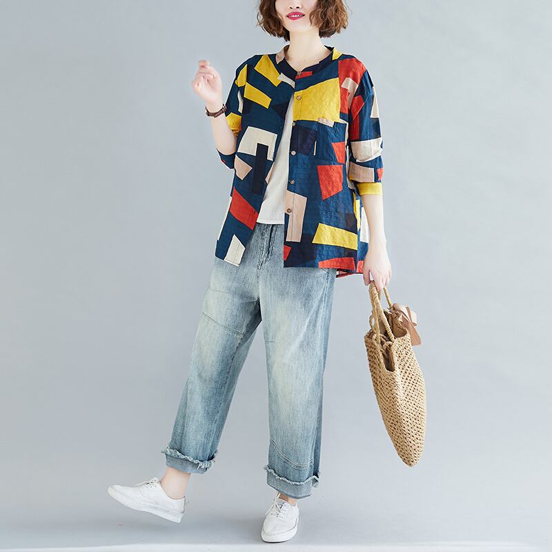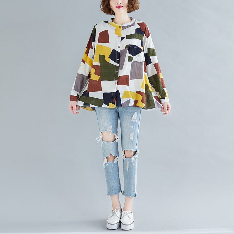 大きいサイズのシャツ女性の脂肪mm文学ファン幾何学的な印刷綿とリネン長袖シャツ春の新しいスタンド襟カーディガン婦人服 ロング コットン 大きめサイズ スプリング 春物 TB2-12 TB2-12415172867