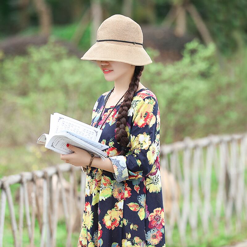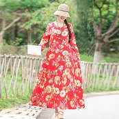 2021年春の新作コットンとリネンのエスニックスタイルのレトロなプリントルーズスリムスリミング長袖ミドル丈ドレス女性 ロング スプリング 春物 TB2-12 TB2-1265199211897
