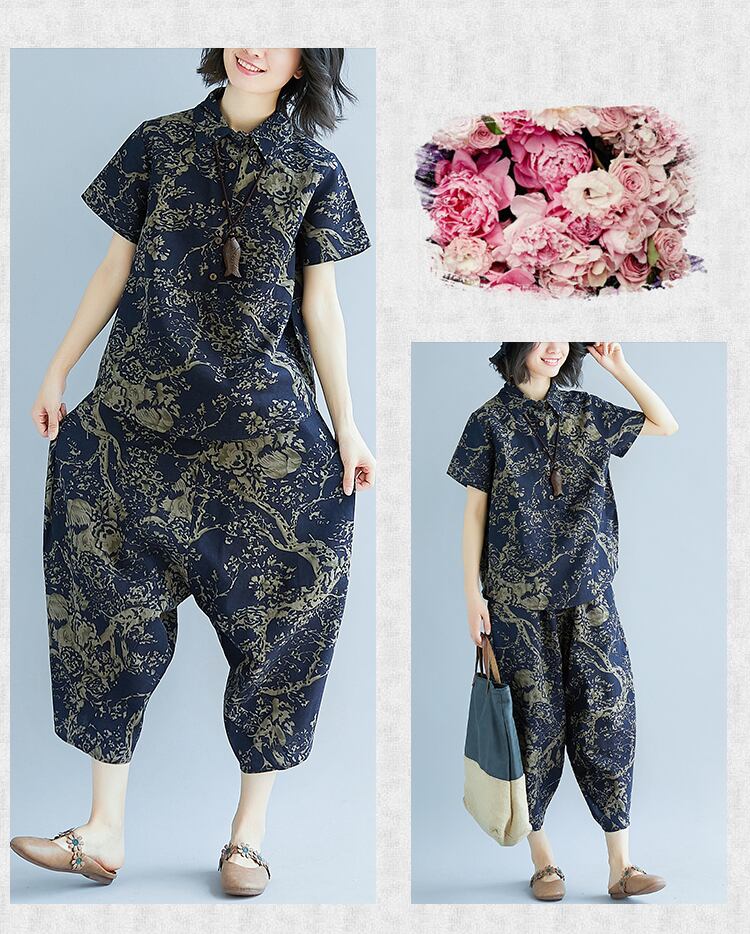 ラージサイズのコットンとリネンのマザーエスニックスタイルのスーツ女性の夏の脂肪MMルーズプリントリネンレトロワイドレッグパンツツーピース 大きめサイズ サマー 夏物 TB2-12 TB2-1227552148409