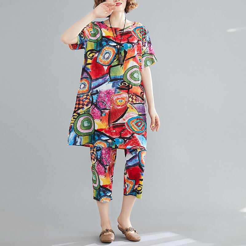 コットンとリネンの柄の下着は、女性の夏の新しいナショナルスタイルのラージサイズのルーズTシャツツーピースワイドレッグパンツに合います 大きめサイズ サマー 夏物 TB2-12 TB2-1271904552946