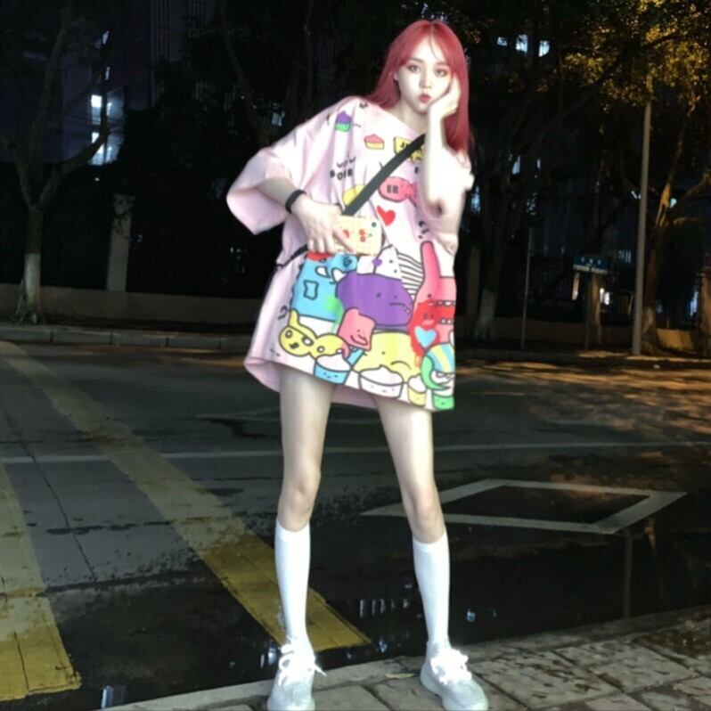 原宿プラスサイズカップルブラウス女性バージョンルーズパーソナリティグラフィティミドル丈半袖学生ラウンドネックフレンドTシャツ 大きめサイズ かわいい Oネック TB2-6 TB2-681852575939
