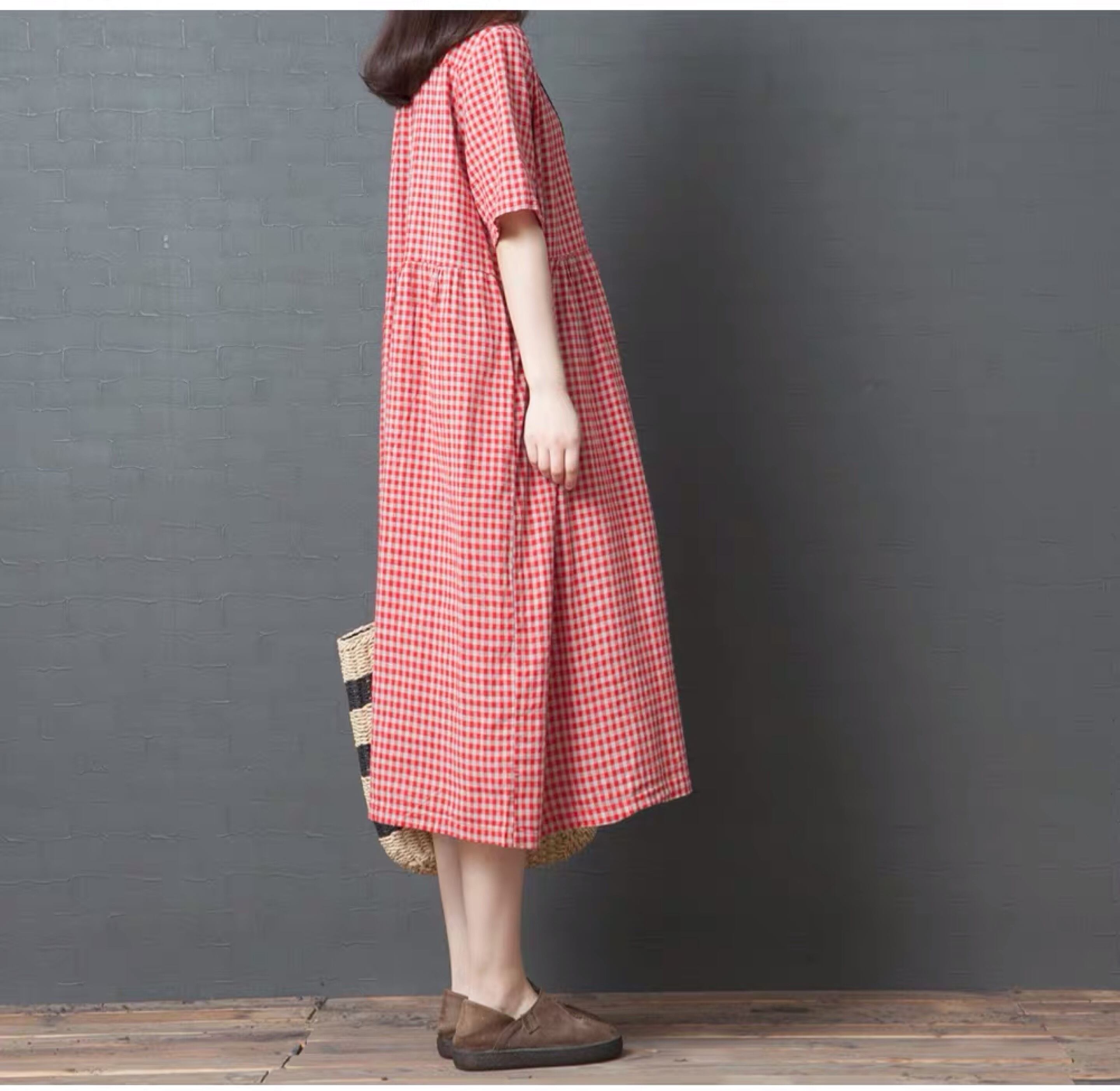 2021年夏の新バージョンのラージサイズのチェック柄ドレスコットンとリネンミドル丈レトロ半袖リネンシャツスカート 大きめサイズ サマー 夏物 TB2-12 TB2-1231889923924