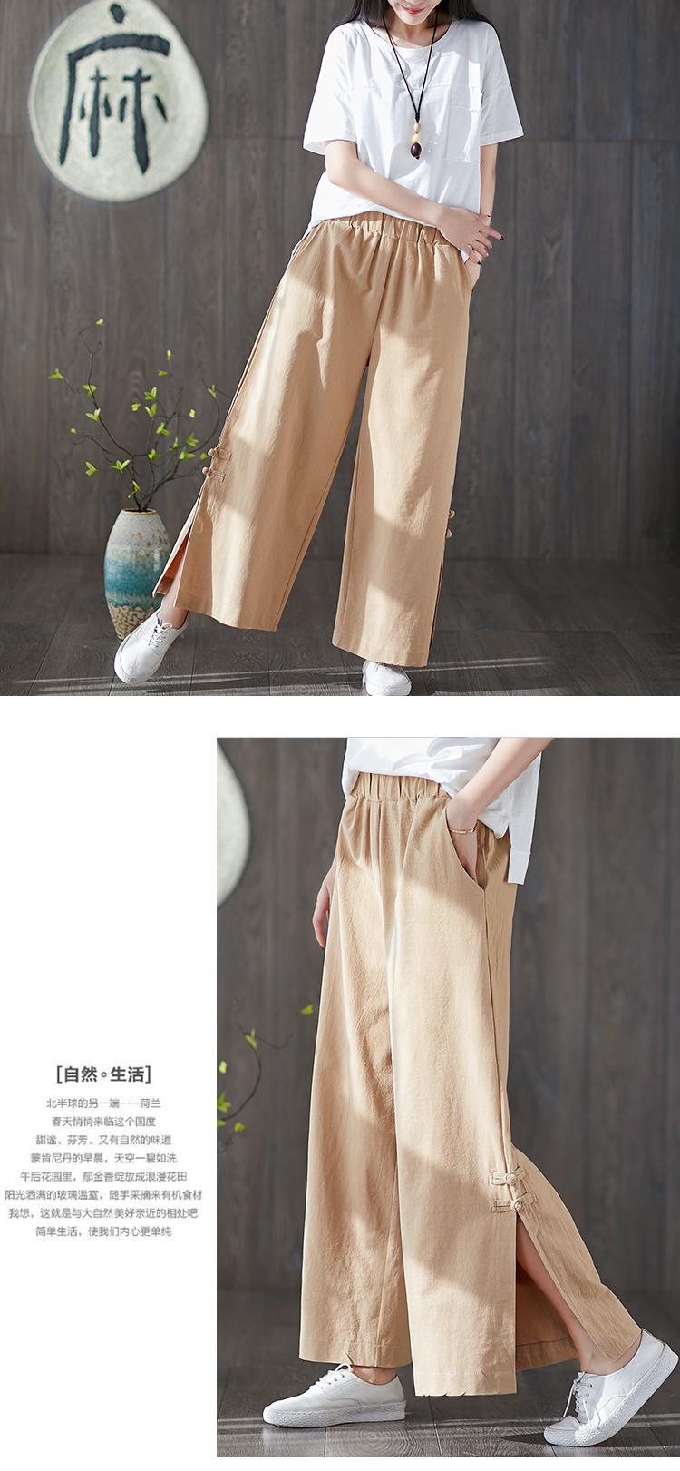 アンクルスリットとバックルコットンとリネンのワイドレッグパンツは薄手のパンツです女性の春の伸縮性ウエストレトロ文学ファンリネンカジュアルパンツ エラスティック スプリング 春物 TB2-12 TB2-1233459611916