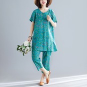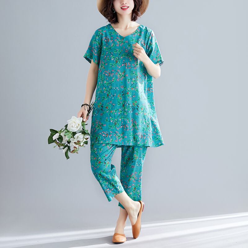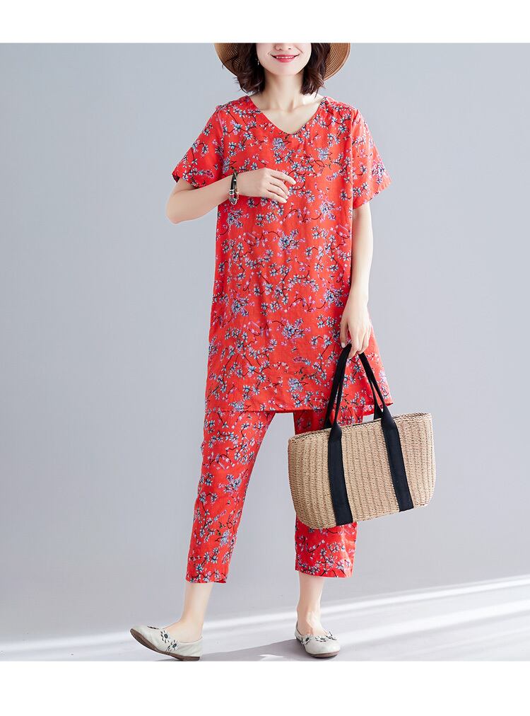 エスニックスタイルのレディースサマードレス新しいルーズラージサイズのプリントスーツ半袖Vネックトップ+9ポイントパンツツーピーススーツ 大きめサイズ 夏物 TB2-12 TB2-1219881633014