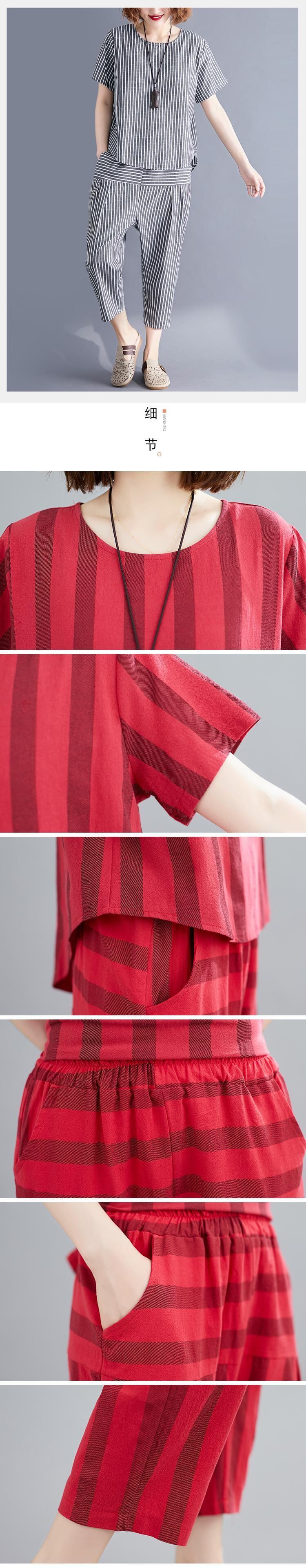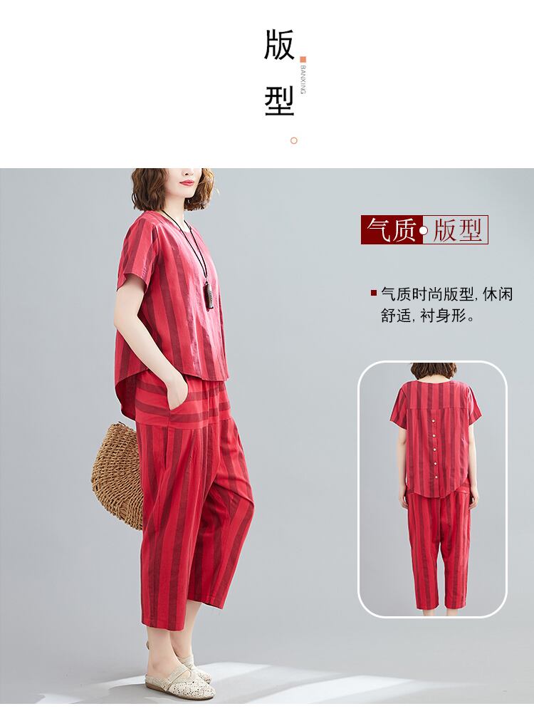 コットンとリネンのカジュアルスーツレディースサマーストライプラージサイズルーズで薄い半袖シャツワイドレッグパンツリネンツーピーススーツ 大きめサイズ 夏物 TB2-12 TB2-1263306188877
