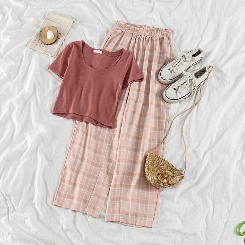 サマースーツレディースインタイドショートトップとカラー半袖Tシャツミドル丈チェック柄ワイドレッグパンツツーピースファッション 夏物 ワイドパンツ TB2-6 TB2-634092261327