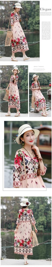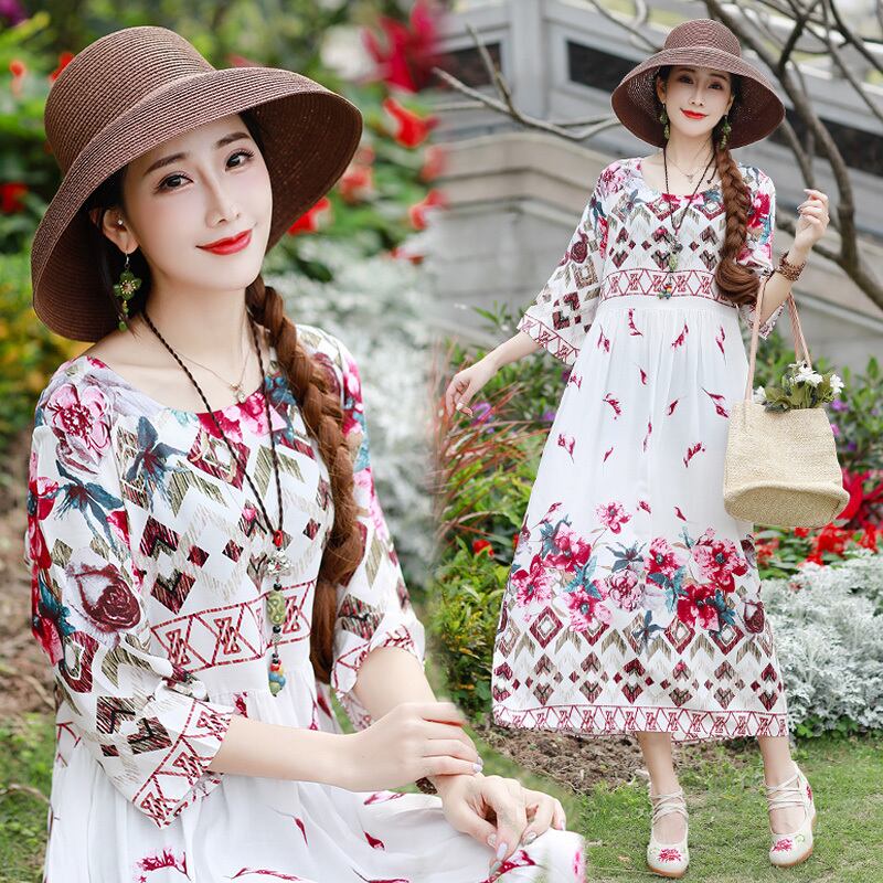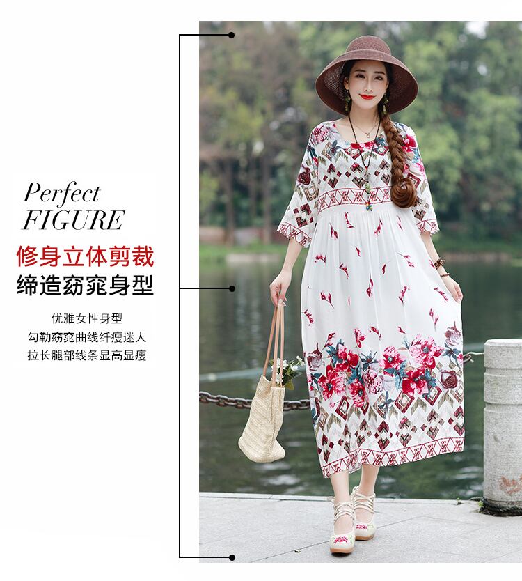 2021年春夏エスニックスタイルの文学的な綿とリネンのプリントドレス、七分袖プラスサイズのルーズレジャーホリデーロングスカート コットン 大きめサイズ スプリング 春物 サマー 夏物 TB2-12 TB2-1286034608007