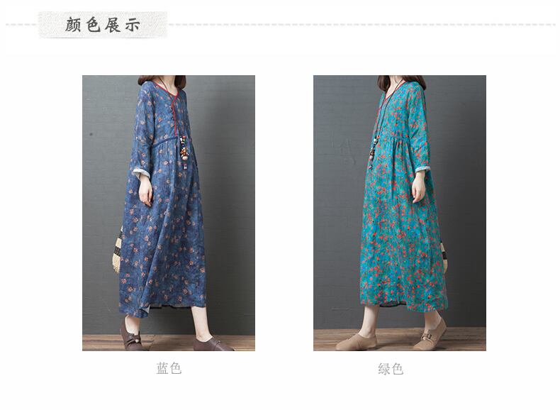 エスニックスタイルのコットンとリネンのドレス女性2021年春秋新作ルーズラージサイズプリントVネックスリムローブミドル丈スカート 大きめサイズ スプリング 春物 オータム 秋物 TB2-12 TB2-1284386641200