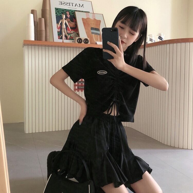 サマーブラックVネックドローストリングショートアンビリカルルーズTシャツレディースバージョンは薄めスリム半袖イントップタイド 夏物 TB2-6 TB2-610586496105