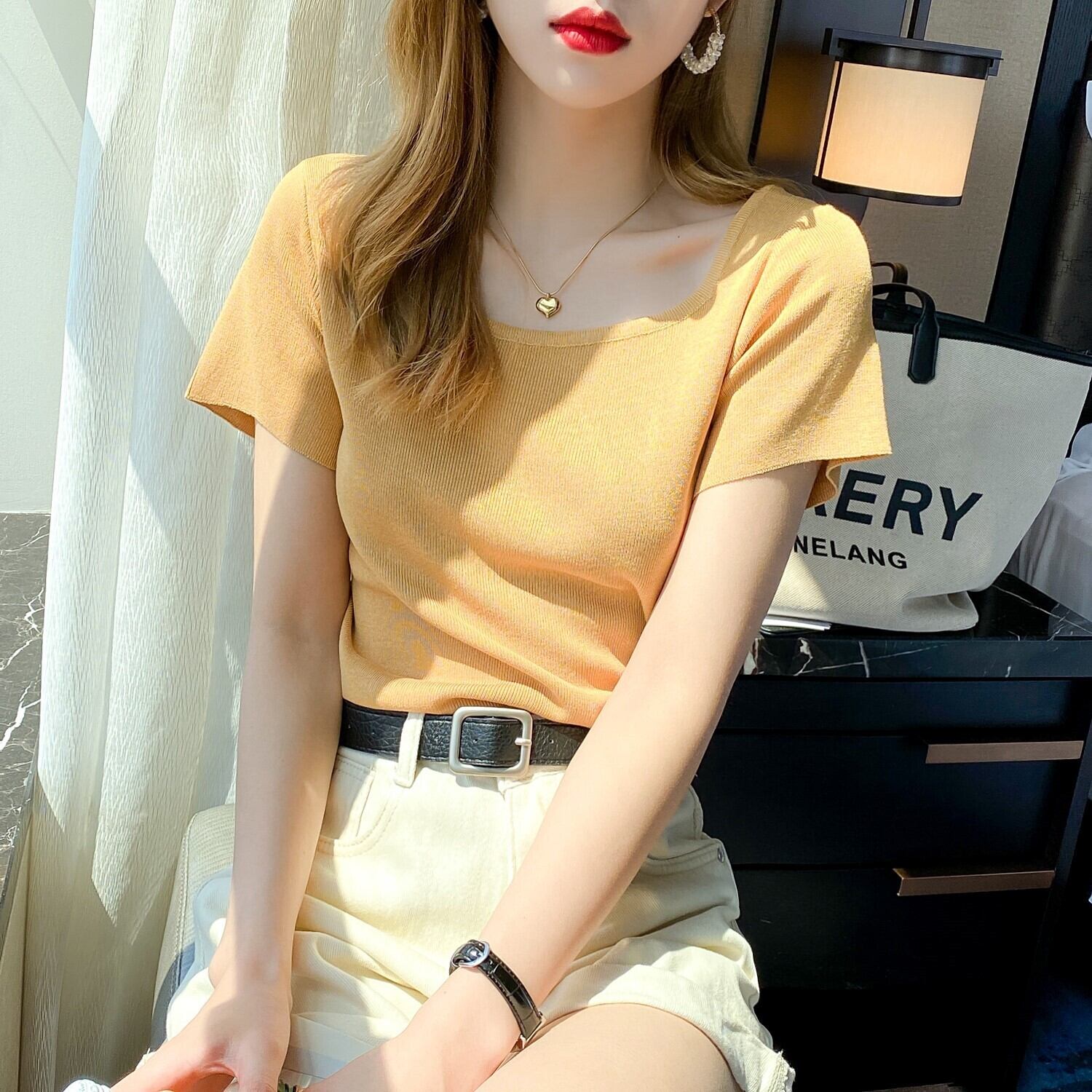 アイスシルクニット半袖Tシャツ女性2021年夏の新作スクエアカラーフレンチレトロブラウスハイウエストショートコンピオンシャツ ハイウェスト サマー 夏物 スクウェア TB2-6 TB2-662703200517